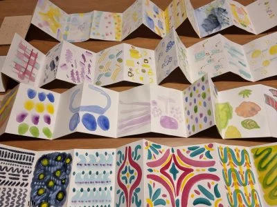 종이죽으로 자신이 일상에서 가장 많이 쓰는 물건을 담을 수있는 그릇이나 컵을 만들어봅니다. 이때 종이죽은 그림그릴 때 만들어진 파지를 잘 모아두었다가 섞어줍니다. 그려놓았던 화첩 속 그림 중 몇 가지를 뽑아서 단순화 과정을 거쳐 패턴을 만들고 화첩의 남은 부분에 그려 기록합니다.