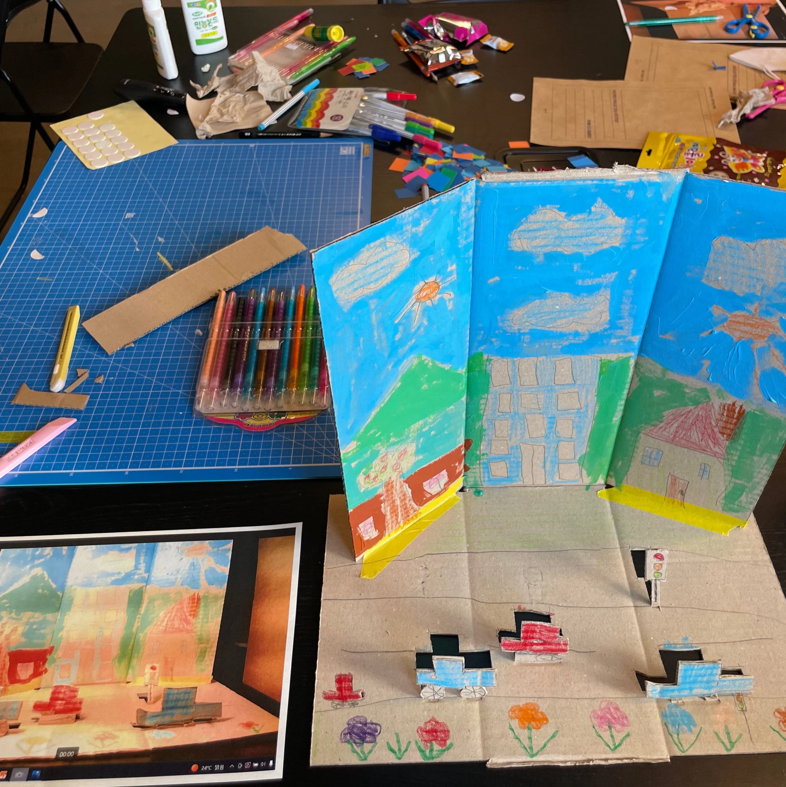 무빙촬영에 대해 이해해 본다. 정지 된 이미지가 움직인다면? 우리 가족의 추억이 담긴 장소를 떠올리며, 함께 타고 떠날 운송수단을 만들어 본다. 배, 비행기, 로켓, 자전거 등 내가 타고 떠날 운송수단을 만들고, 가족과 함께 떠났던 혹은 떠나고 싶은 장소를 배경에 그려 본다. 파도가 출렁이는 바다, 맑은 하늘이 깨끗하게 펼쳐진 휴양지, 푸르른 나무가 울창이는 숲속  등 우리 가족만의 추억이 담긴 장소를 배경에 그린 뒤 무빙촬영을 시작한다. 나의 착륙은 어디로 향할까요?