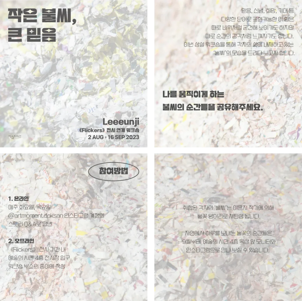 믿음, 신념, 희망, 기대 등 다양한 단어로 표현 가능한 이 힘은 때로 바위처럼 굳건해 보이기도 하지만, 때로 순간의 감각처럼 느껴지기도 합니다. 짧은 일상에서부터 긴 삶까지를 아우르는 불씨의 순간들을 공유해주세요(2023. 8. 2. ~ 8. 19.). 이번 상설 워크숍을 통해 각자의 삶에 내재하고 있는 ‘불씨’의 모습을 드려다 보고자 합니다.