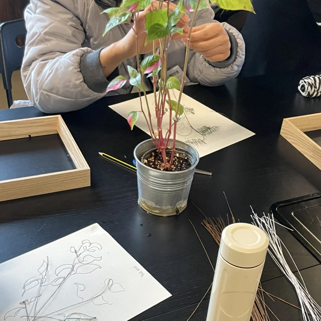 식물에 시선을 고정한 채 식물을 하나의 선으로 연결하여 그려 본다. 종이위에 그려진 나의 드로잉을 얇은 철사로 제작한 후 다른 이들의 작품과 겹쳐서 감상해 본다. 식물은 금방 부러지지만, 철사는 잘 구부려지고 유연하고 질기기 때문에 철사라는 재료를 사용하여 식물드로잉을 해보고, 인간과 자연의 관계에 대해 생각해보고자 한다.