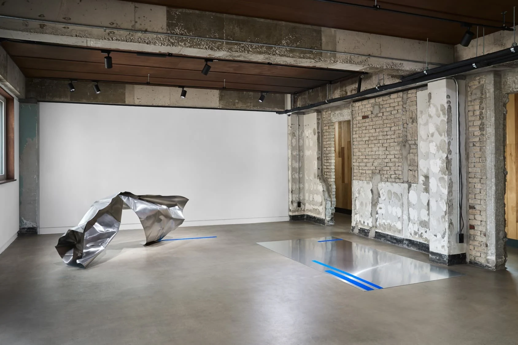 단 3점으로 전시장을 가득 채우고 있는 작품 〈Flat Hunter〉는 언뜻 누군가 던져둔 구겨진 종이처럼 보이기에, 거대한 크기가 갖는 존재감은 가볍고 유동적인 감각을 동시에 자아내며, 독특한 분위기를 보여준다. 이 작품은 공사를 위해 뒤집은 땅의 흙더미에 알루미늄판을 두고 그 언덕이 평평해질 때까지 굴삭기의 힘으로 내리쳐가며 만든 작품이다. 그렇기에 조각은 모래가 빠져나간 흔적처럼 존재한다. 반짝이는 알루미늄의 화려함을 뒤로한 채 조각의 외형을 천천히 살펴보면, 우리는 그 표면에서 날 선 모양으로 접힌 부분, 그리고 뚫리거나 긁힌 무수한 스크래치를 발견하게 된다. 이 흔적들은 애초의 모래언덕이 어떤 형태였을지, 그리고 언덕을 평평하게 하기 위해 얼마만큼의 힘이 가해졌는지를 직관적으로 보여준다. 〈Flat Hunter〉의 제작에서 작가는 산업용 규격에서 가장 큰 사이즈의 알루미늄판을, 그리고 기존에 사용하던 망치가 아닌 인간의 힘을 능가하는 굴삭기의 힘을 빌려온다. 작가의 굴삭기는 문명을 창출하는 인간의 행위를 모방하듯 눈 앞의 거친 땅을 평평하게 하지만, 그와 동시에 그 생성물인 알루미늄 조각을 오류의 덩어리로 만들어 버린다.