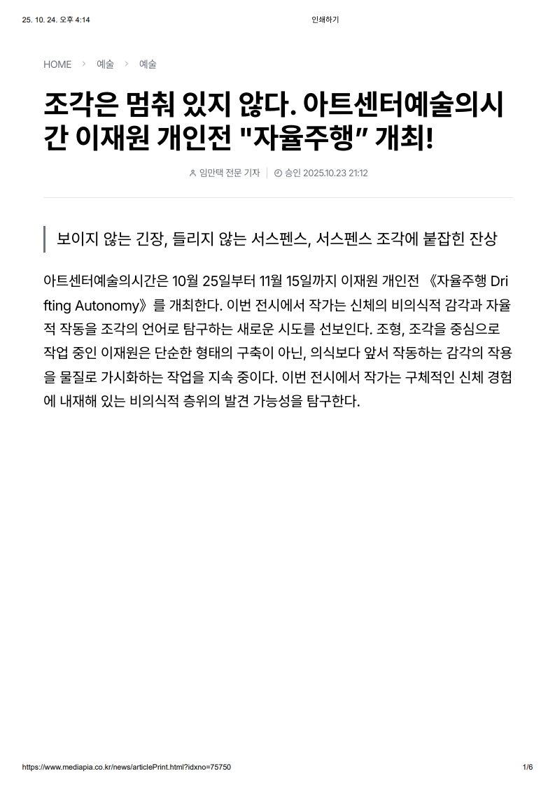 [미디어피아 2025. 10. 23.] 조각은 멈춰 있지 않다. 아트센터예술의시간 이재원 개인전 "자율주행" 개최!