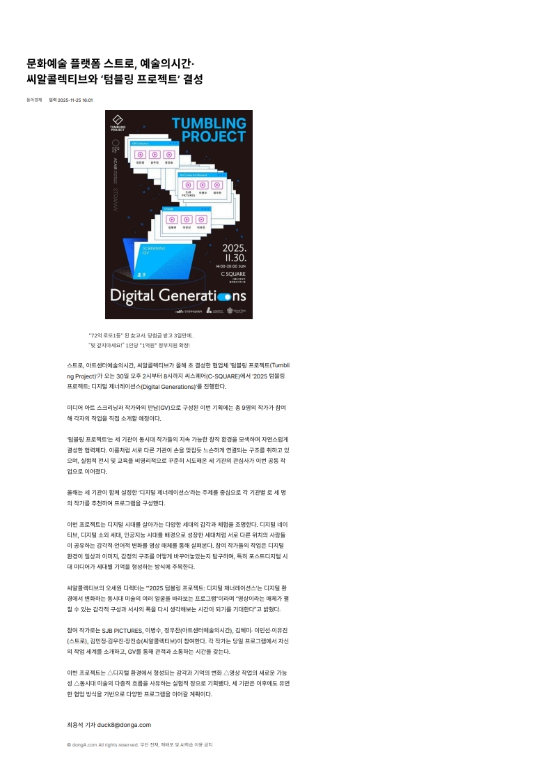 [동아경제 2025. 11. 25.] 문화예술 플랫폼 스트로, 예술의시간·씨알콜렉티브와 ‘텀블링 프로젝트’ 결성