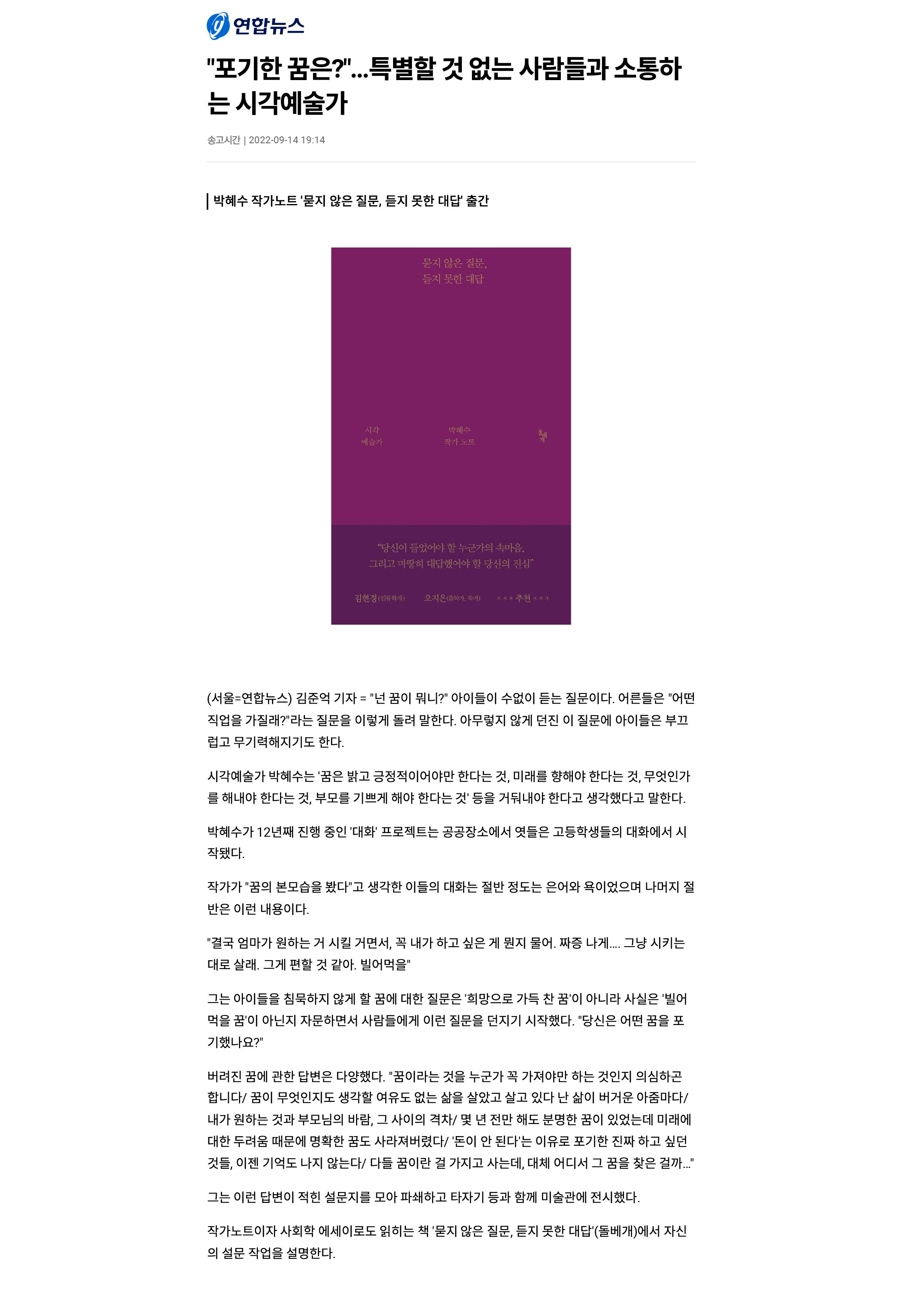 [연합뉴스 2022. 9. 14.] "포기한 꿈은?"…특별할 것 없는 사람들과 소통하는 시각예술가