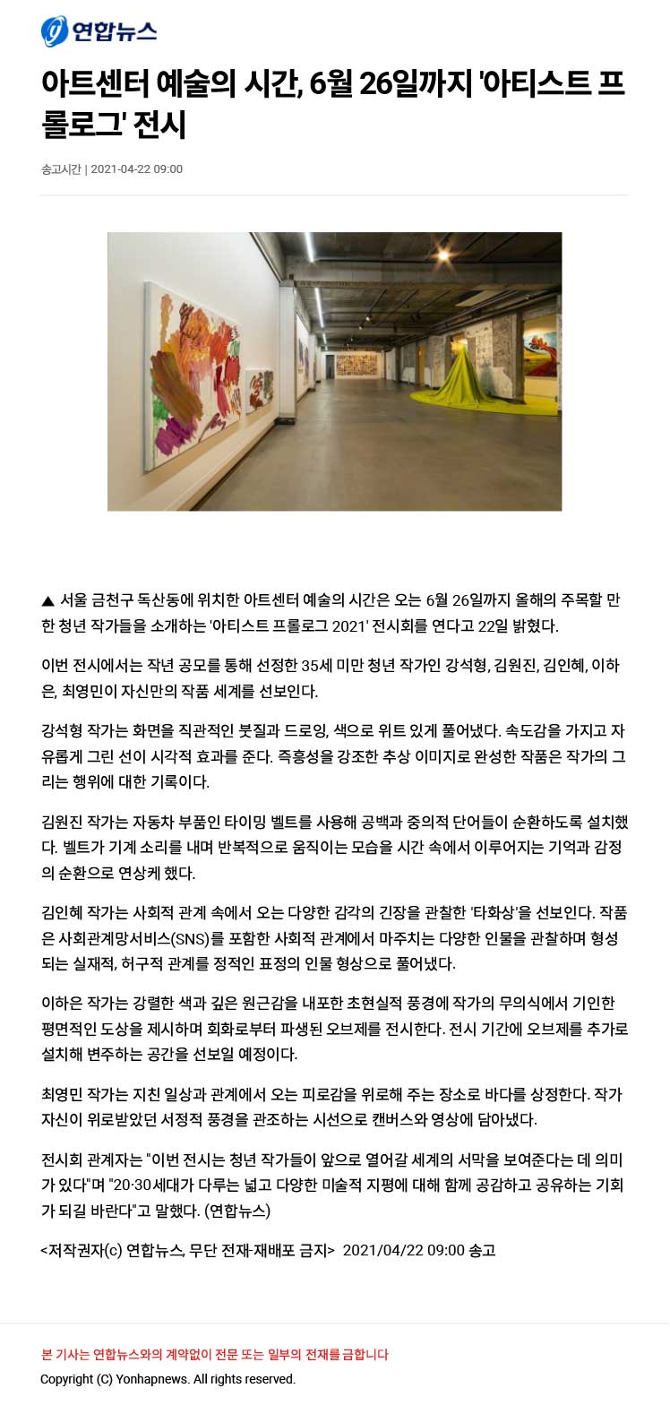 [연합뉴스 2021. 4. 22.] 아트센터 예술의 시간, 6월 26일까지 '아티스트 프롤로그' 전시